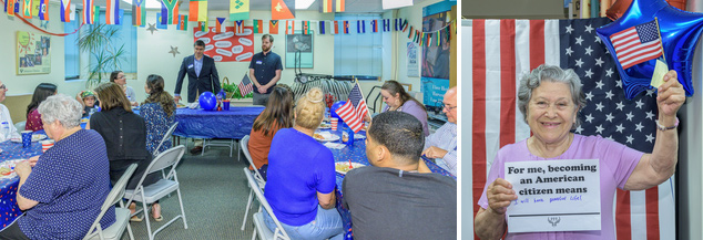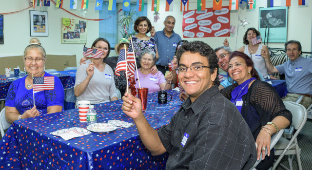 As a potluck event, we were fortunate to have clients bring in delicious dishes and desserts from their own cultures. We enjoyed homemade baklava, delicious dumplings, fried yucca, true Italian pasta, tasty meatballs and more! Among the favorites was a cake decorated to resemble an American flag, the work of one of our own citizenship caseworkers, Maggie Kenney.