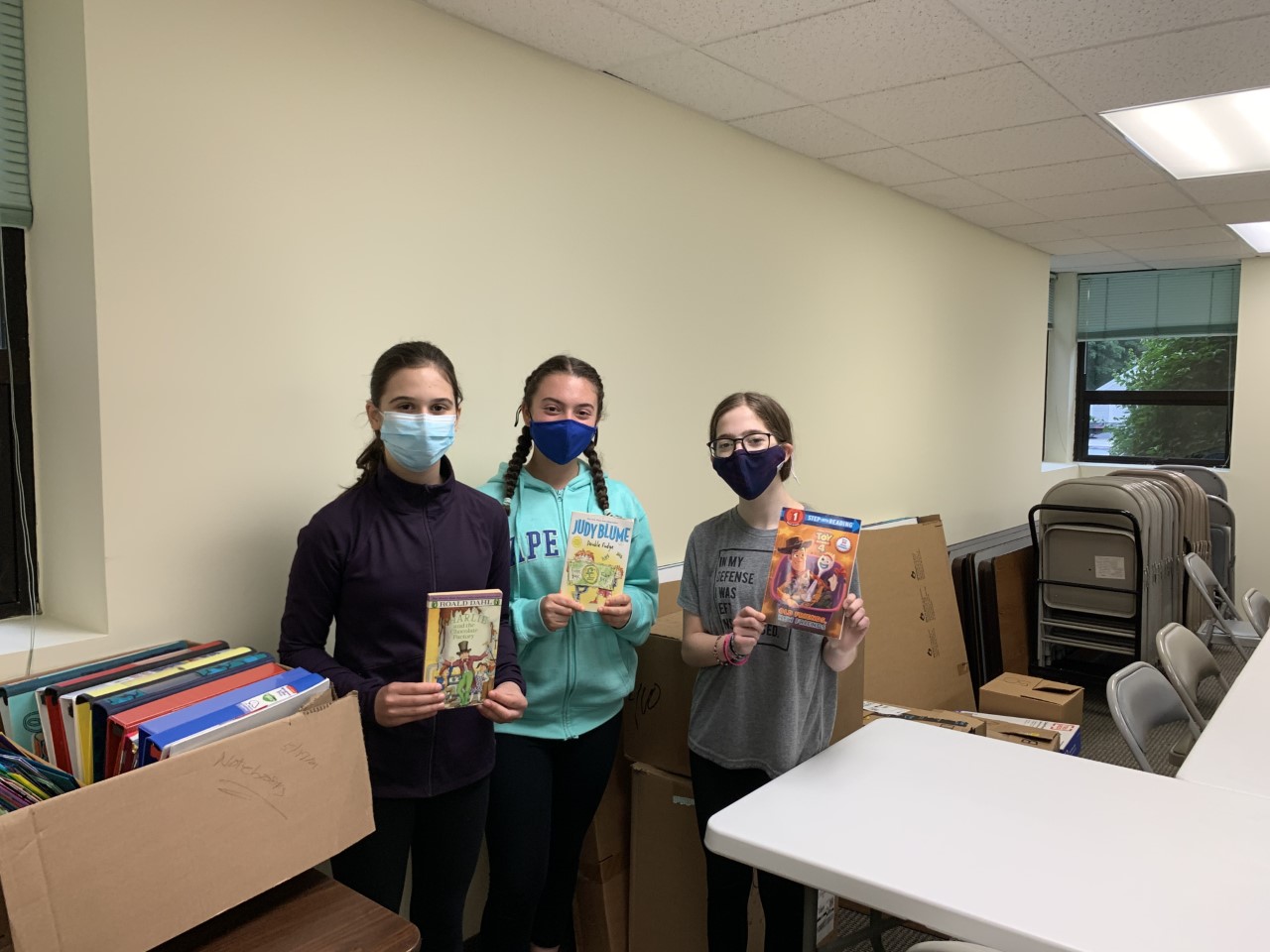 Sophie Donahue, Ella Richer, and Leah Salloway joined forces and coordinated a book drive at their school. Their dedication and hard work led to a collection of 900 books! After the drive ended, they packed all the books up, and with the help of some adult drivers, delivered a huge carload to the JFS offices.